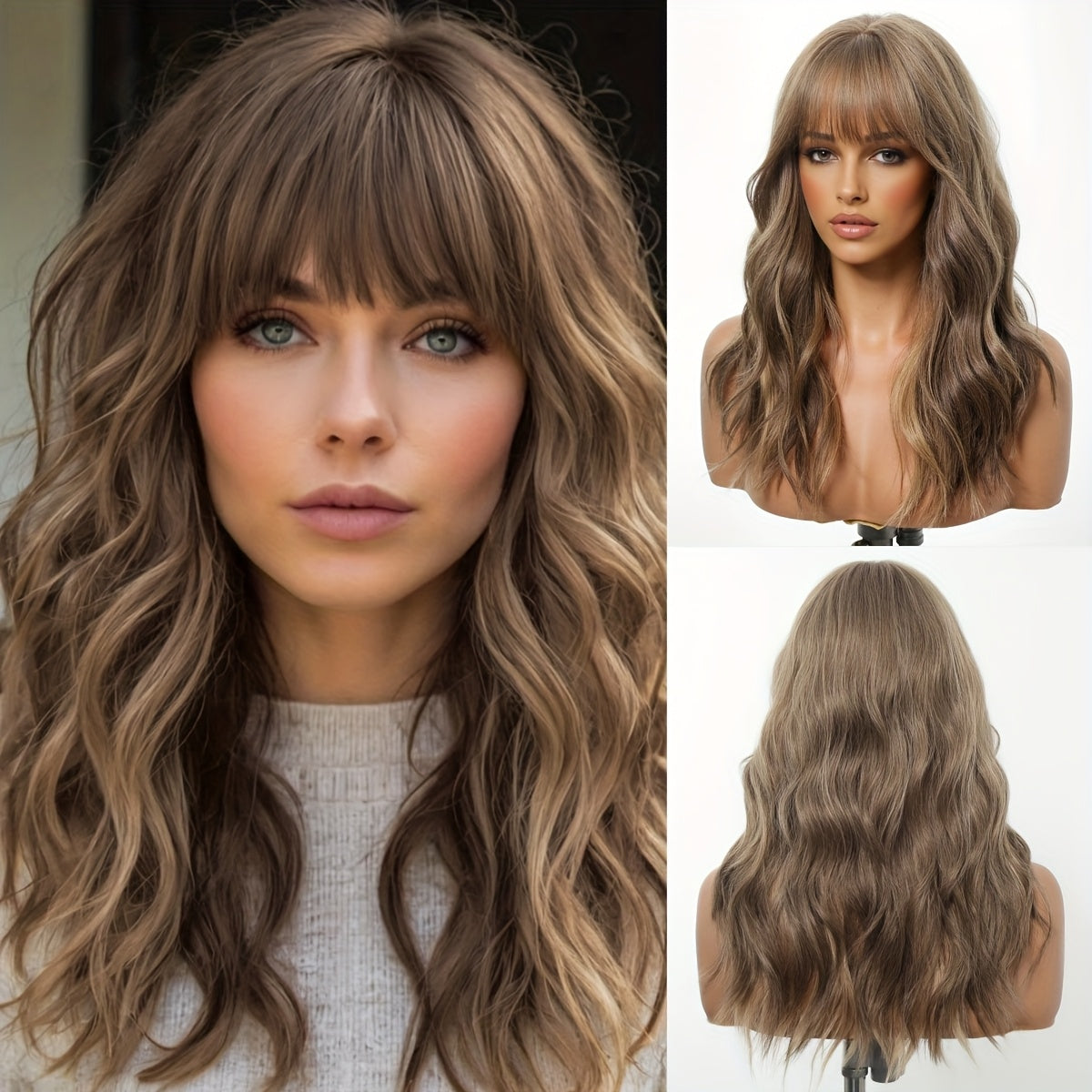 Effortless glam: 20-inch (50 cm) brown long curly wig with bangs crafted from high temperature fiber for a natural look and long-lasting style. Soft body wave curls and a rose net cap provide comfortable wear and easy styling for everyday, work, events, and parties.