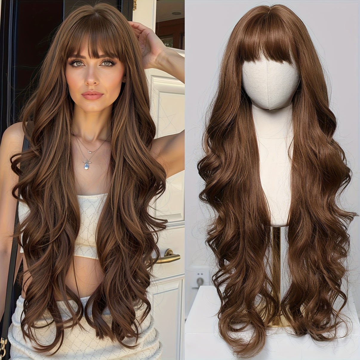 Effortless glamour: this 30-inch (76 cm) brown curly wig with bangs combines a natural silhouette with breathable comfort for daily wear, travel, parties, and weddings. The rose net cap and...