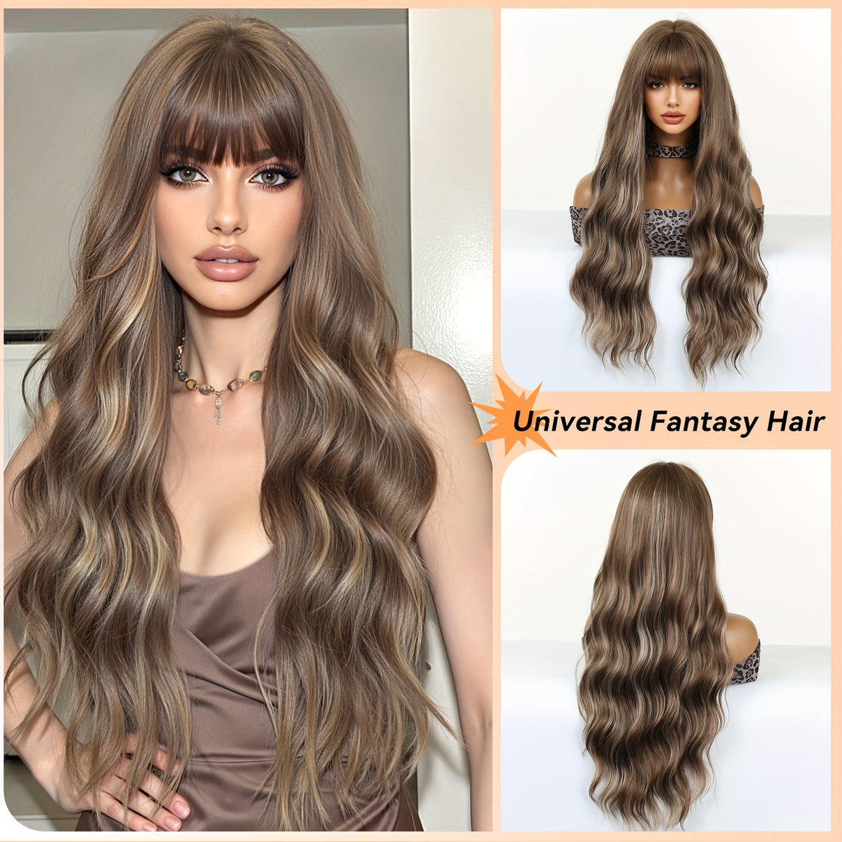Effortless glam: elevate your look with this long wavy synthetic wig featuring rich dark brown tones blended with warm chestnut highlights. Soft, heat-tolerant high temperature fiber delivers natural movement, full-bodied curls and lasting volume for everyday wear, parties, cosplay, festivals and special events. Comfortable rose net cap construction fits most head shapes and provides breathable all-day wear.