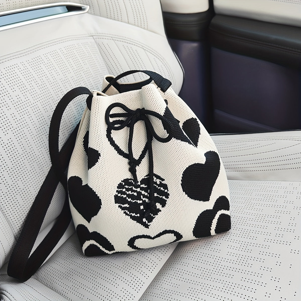 Mini Heart Pattern Bucket Bag - Drawstring Shoulder & Crossbody Handbag