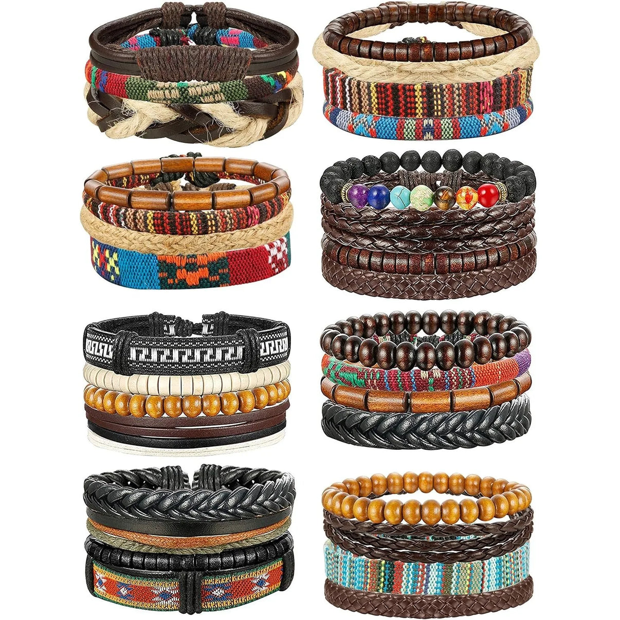 Stylish and versatile, this 31-piece bracelet set mixes braided leather, hemp cords, wooden beads and stainless steel accents for an effortless boho-tribal look. Perfect for layering, gifting, or everyday wear for men and women.