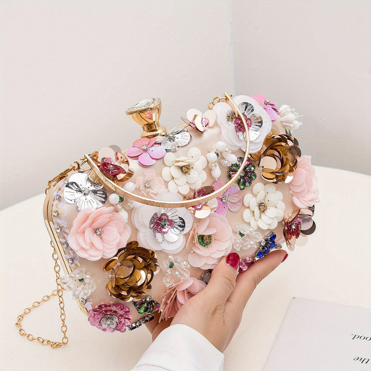 Sparkle at every celebration with this mini flower evening clutch — a compact rhinestone-adorned applique bag designed for weddings, parties, and special nights out. Lightweight polyester construction and a secure kiss-lock closure keep your essentials elegant and easy to carry.