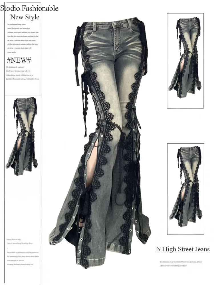 Elevate your spring and summer wardrobe with these high-waist lace-up flare jeans. Featuring eyelet details, retro stitch accents, and a split bootcut hem, these slim bell-bottoms combine vintage charm with modern streetwear style for a flattering, office-to-weekend look.