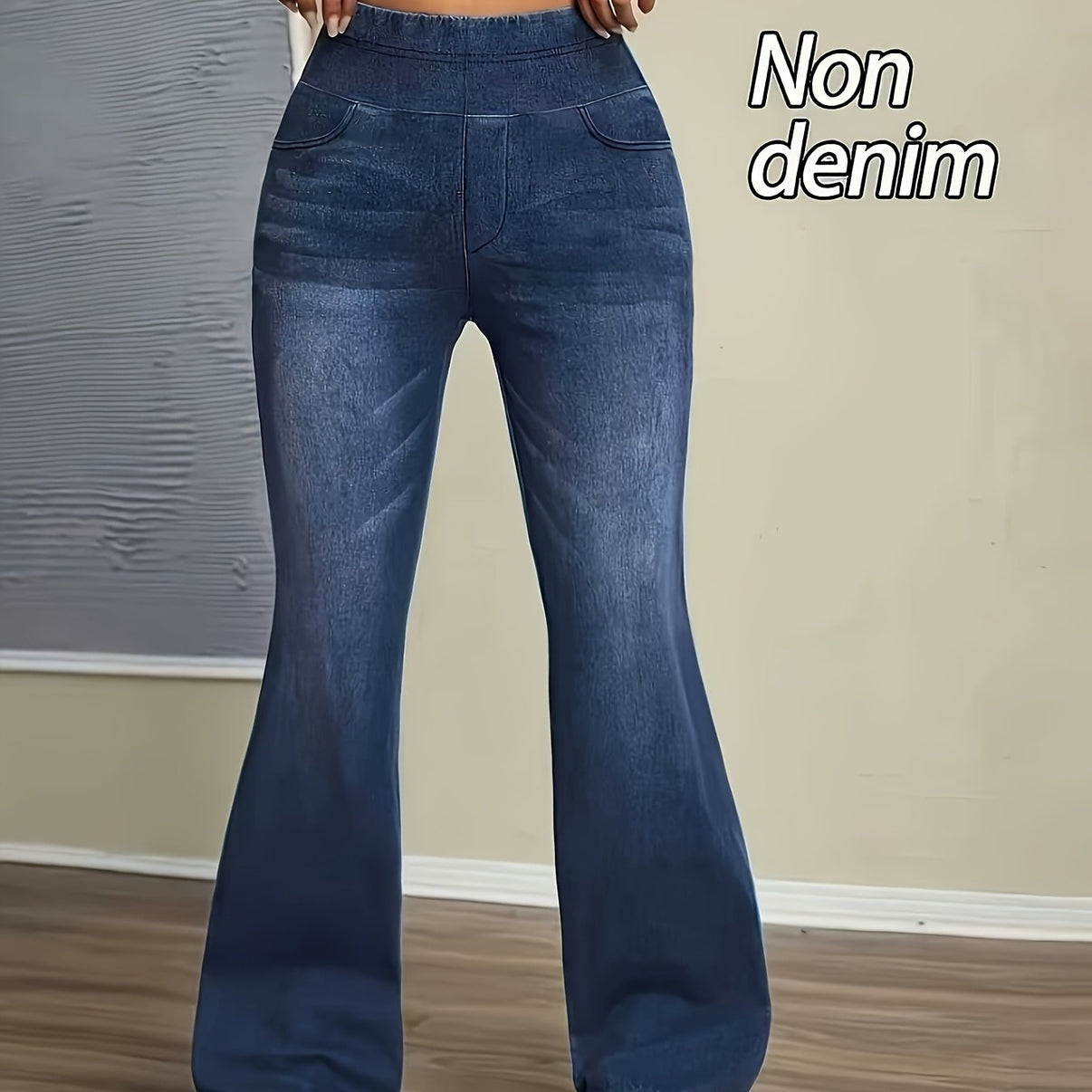 Flatter your curves in these plus size high-waisted bell-bottom jeans featuring a light wash imitation denim look, medium stretch knit for comfort, and a fashion-forward wide-leg flare with digital positioning print. Perfect for casual days or semi-formal outings in spring, summer, and fall.