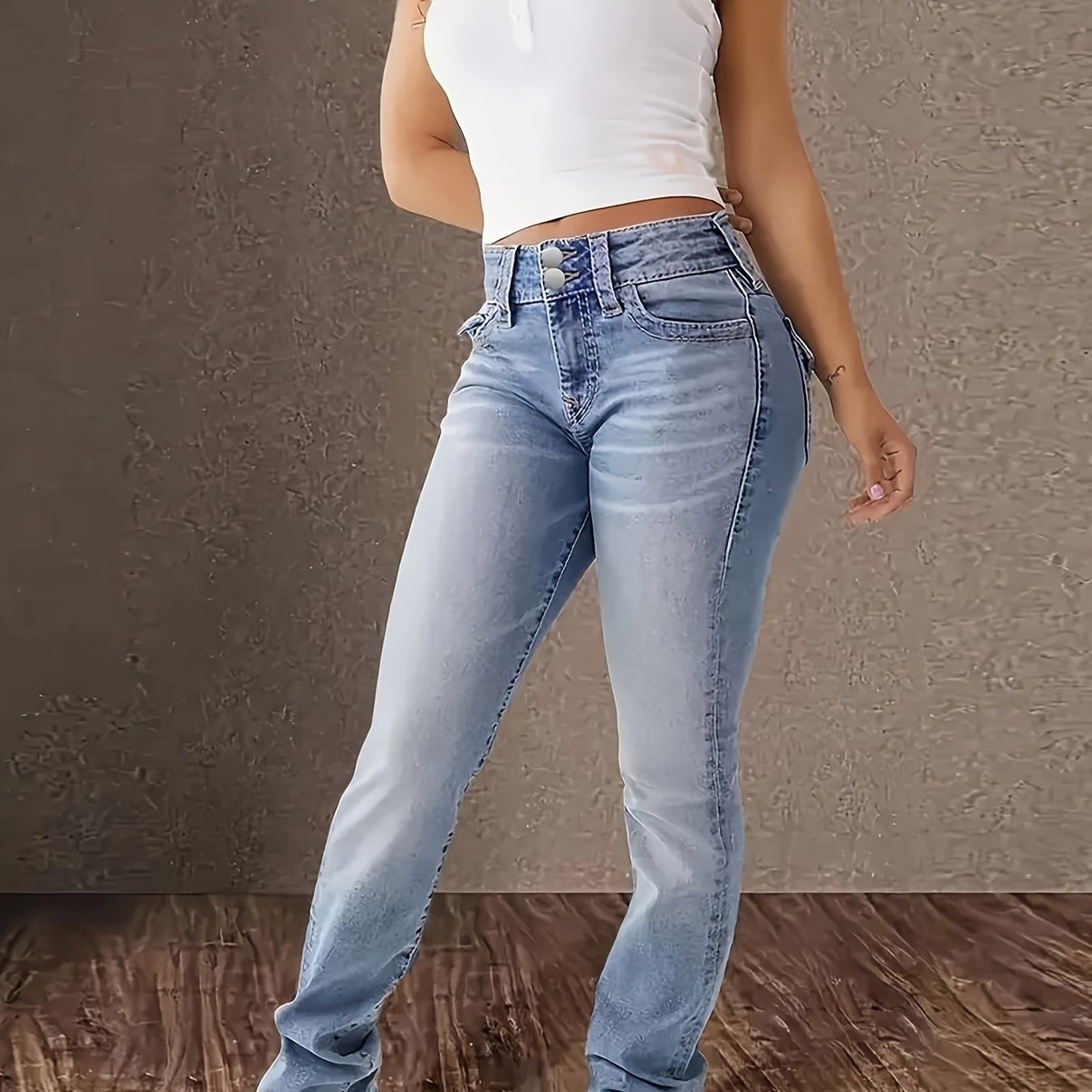Product Description: Flattering plus size high-waisted jeans crafted from soft, high-stretch denim for all-day comfort. These washed blue straight-leg trousers feature a double-button with zipper fly for a secure fit, a woven construction for durability, and easy machine-wash care. Ideal for casual or elegant styling across all seasons.