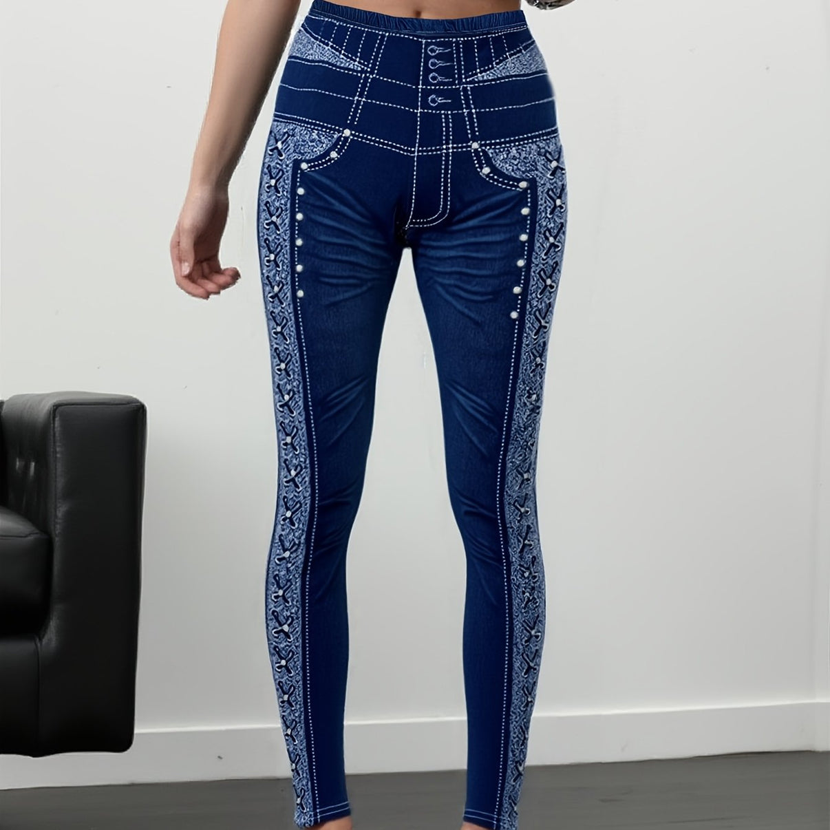 Elevate your everyday wardrobe with these women's high-waisted skinny jeans featuring a stylish imitation denim print. Made from high-stretch knit polyester, they offer a non-see-through, figure-flattering silhouette with an elastic waistband for all-day comfort. Versatile enough for casual and dressy looks and easy to care for—machine washable for convenient, year-round wear.