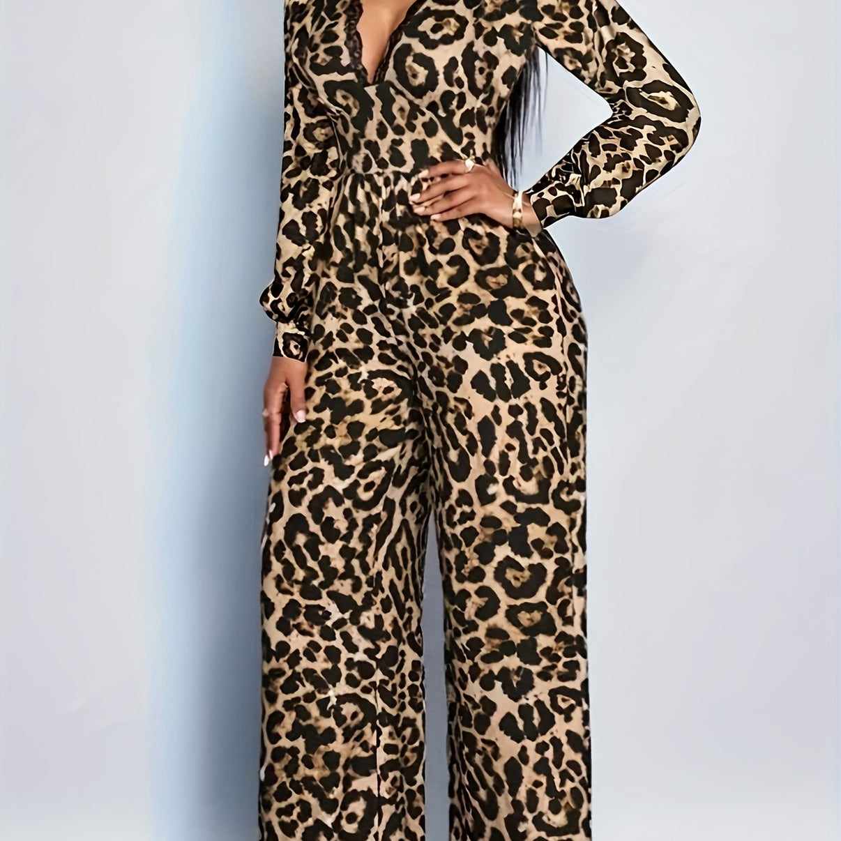 Unleash effortless glamour with this elegant leopard print jumpsuit—designed for all-season wear with a flattering V-neck, long sleeves, wide-leg silhouette, and delicate lace trim for parties, weddings, or elevated everyday...