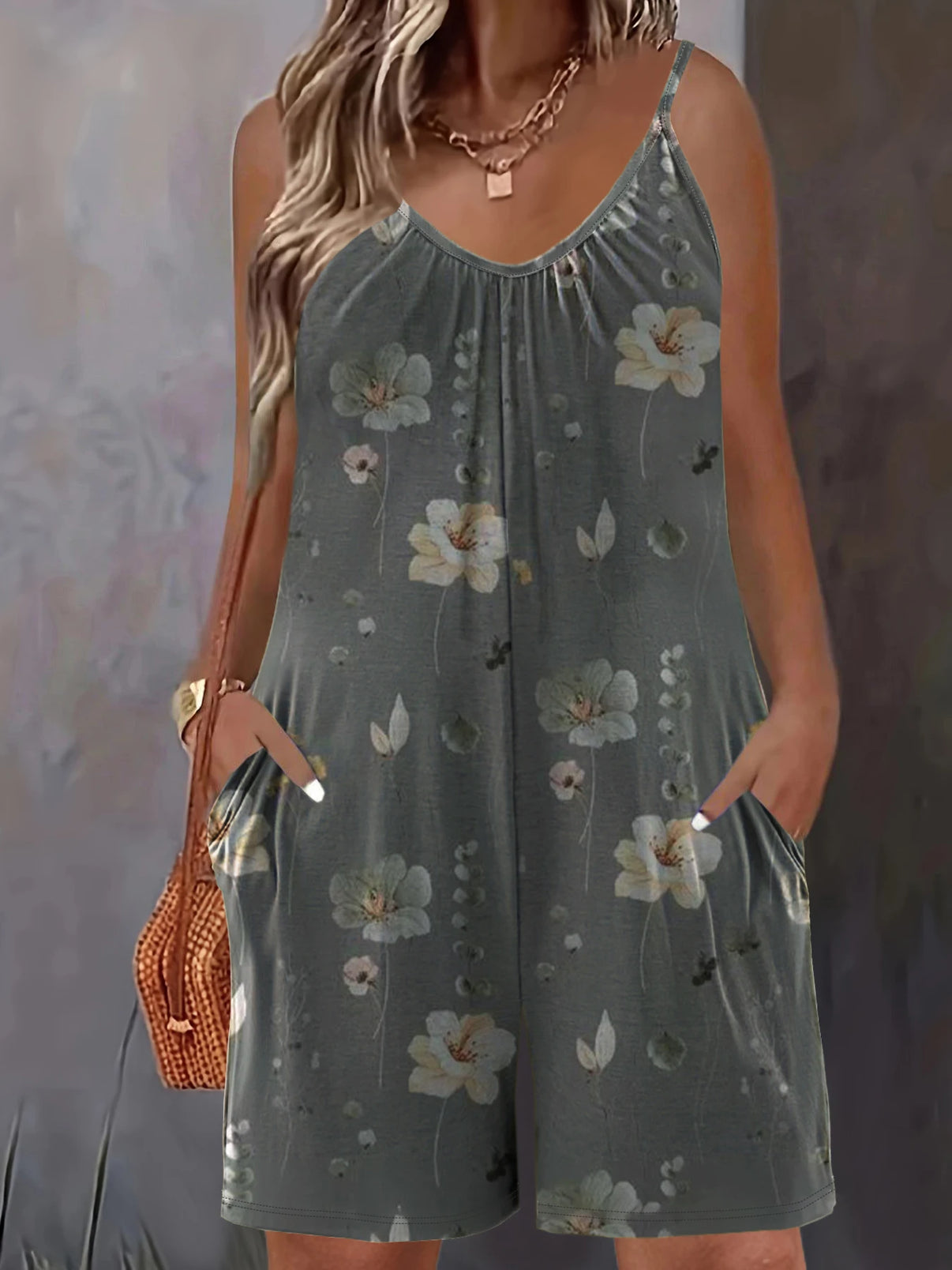 Effortless and flattering, this plus size cami romper features an allover floral print, ruched detailing and convenient pockets for everyday style and comfort. Specifications: Material: Polyester, Spandex Fabric Type: Polyester...