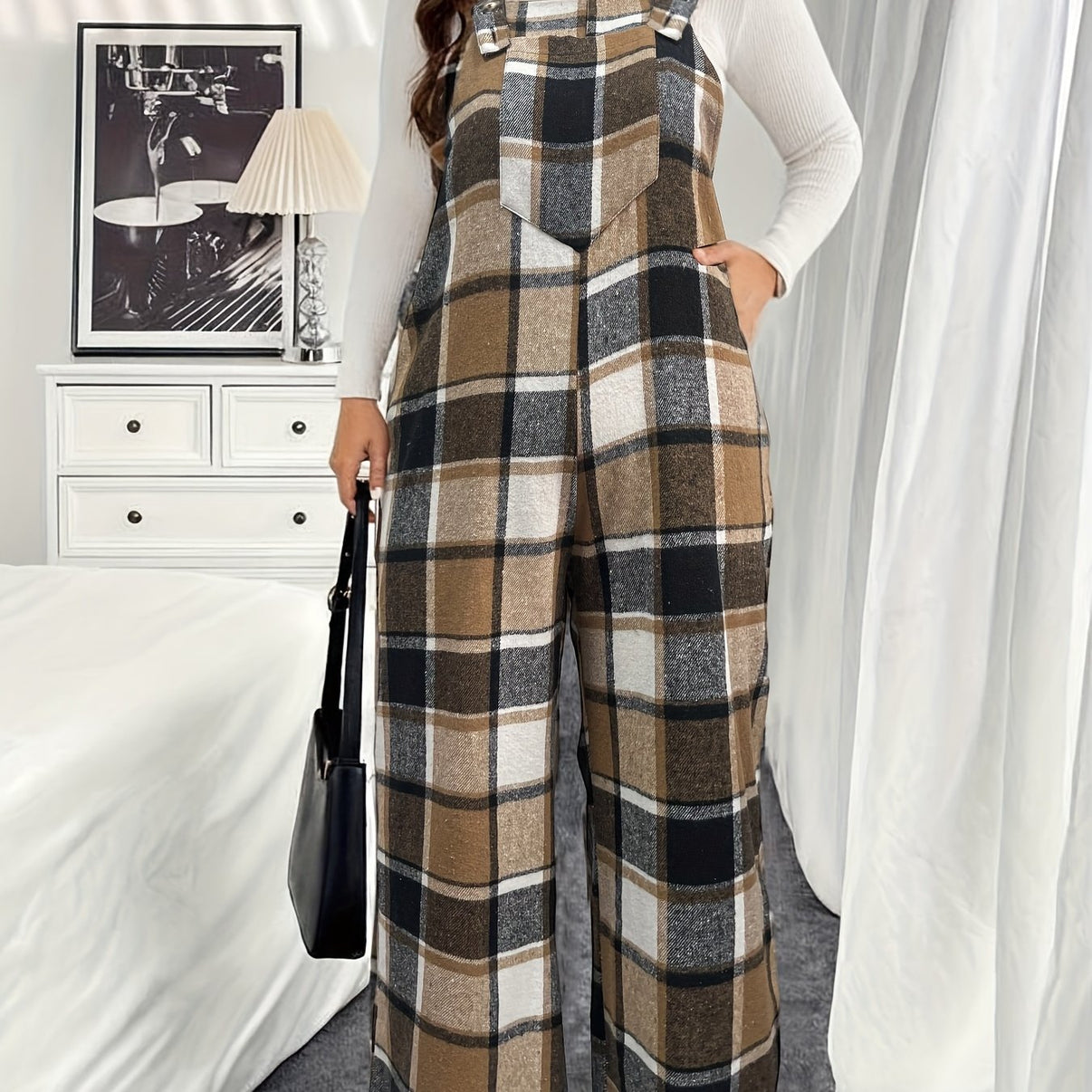 Hashtags: #PlusSizeFashion #PlaidJumpsuit #WorkToCasual
