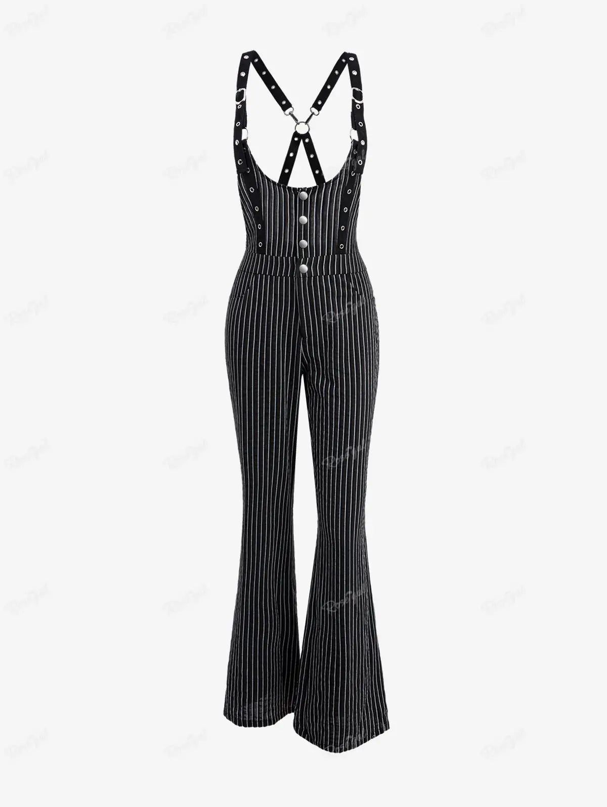 Embrace edgy elegance with this gothic striped backless jumpsuit featuring crisscross O-ring straps, buckle and grommet details, and handy pockets. The sleeveless full-length silhouette combines alternative style with everyday comfort...