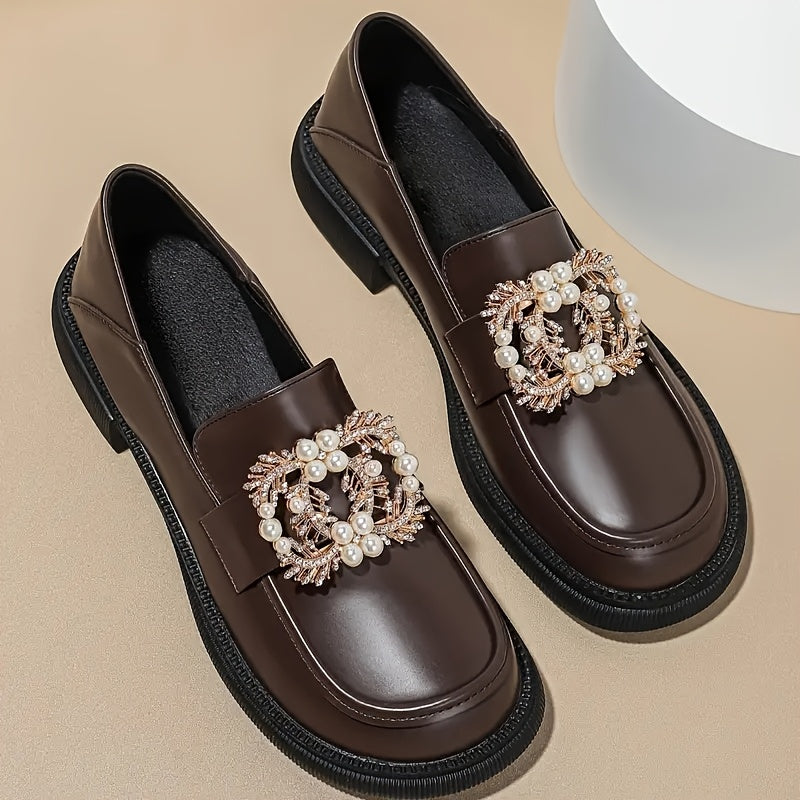 Effortless comfort meets feminine detail in these women's brown slip-on loafers. Designed for everyday wear, they feature a pearl flower buckle, a cushioned microfiber insole and a non-slip thick PVC sole for steady steps and all-day comfort.