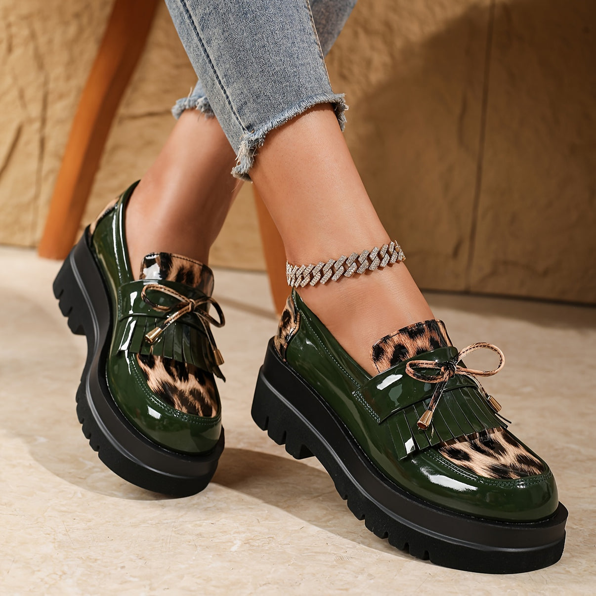 Effortless glamour meets everyday comfort in these women's leopard print tassel loafers. The glossy synthetic upper and decorative tassel bow add polish while the thick cushioned PU sole delivers all-season support and reliable traction for casual, work, or weekend wear.