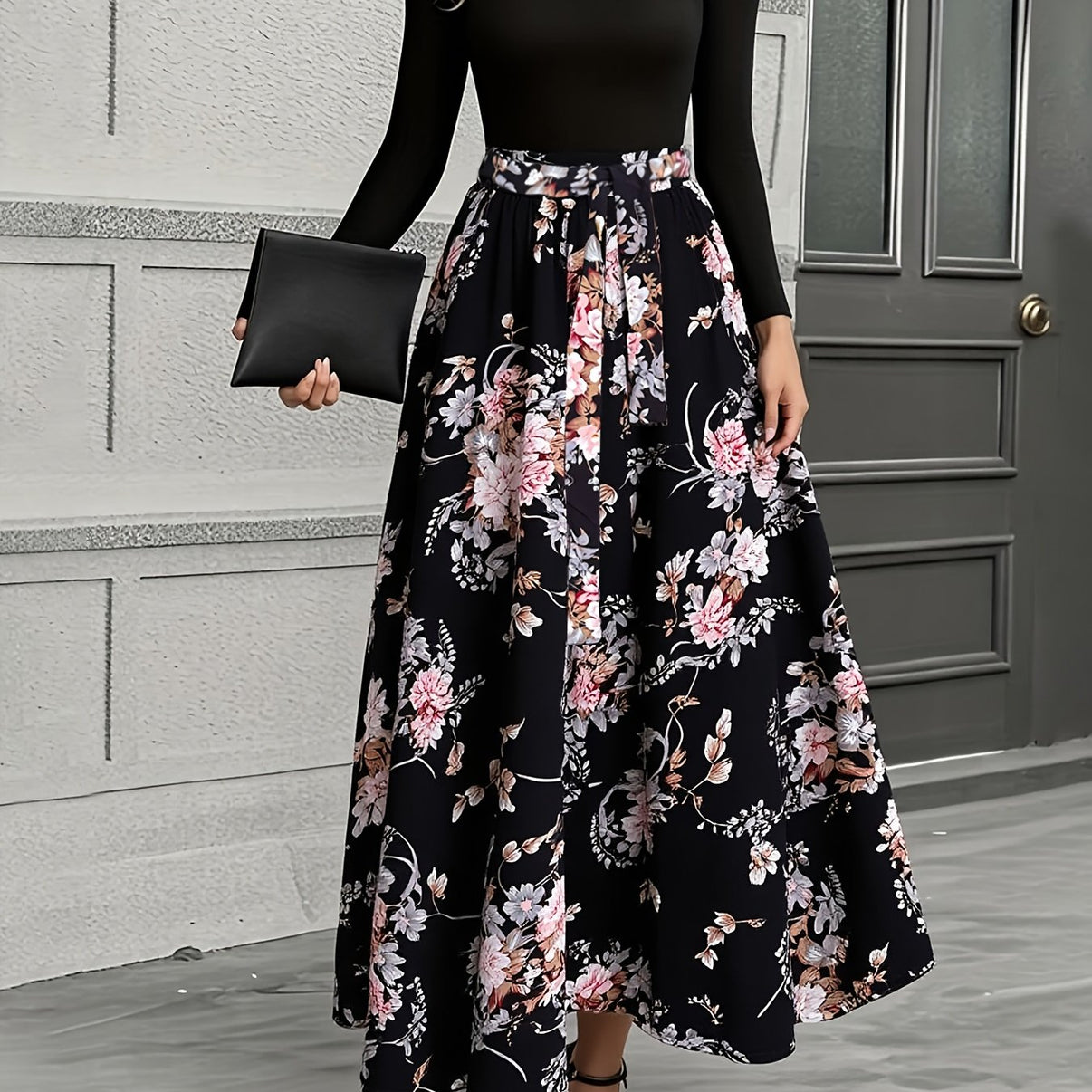 Product Description: An elegant black and white floral maxi dress crafted from lightweight woven polyester. Featuring a high-waisted A-line (pendulum) silhouette, long sleeves and a crew neck, this versatile fall/winter dress moves seamlessly from casual daytime outings to formal events. Micro-elastic fabric ensures comfortable drape and easy layering, while machine-washable care keeps maintenance simple.