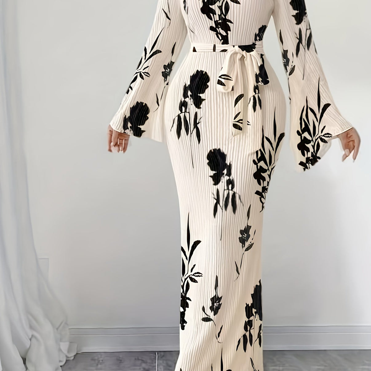 Elegant Pleated Long-Sleeve Flared Dress with Belt – Women's Autumn/Winter Knit Polyester