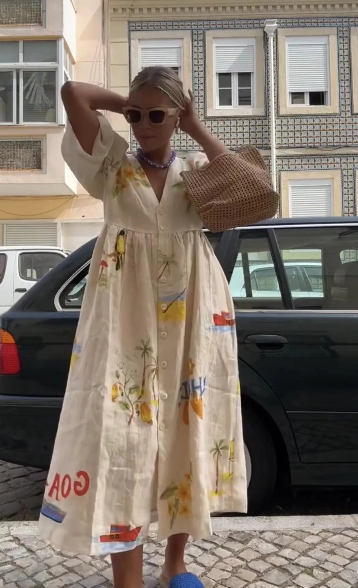 Effortlessly chic, this printed V-neck A-line midi dress combines a flattering empire waist with puff sleeves and single-breasted details for a breezy, streetwear-ready summer look. The lightweight polyester-spandex blend delivers comfortable, loose fit and easy movement—perfect for casual outings, daytime events, or layered looks.