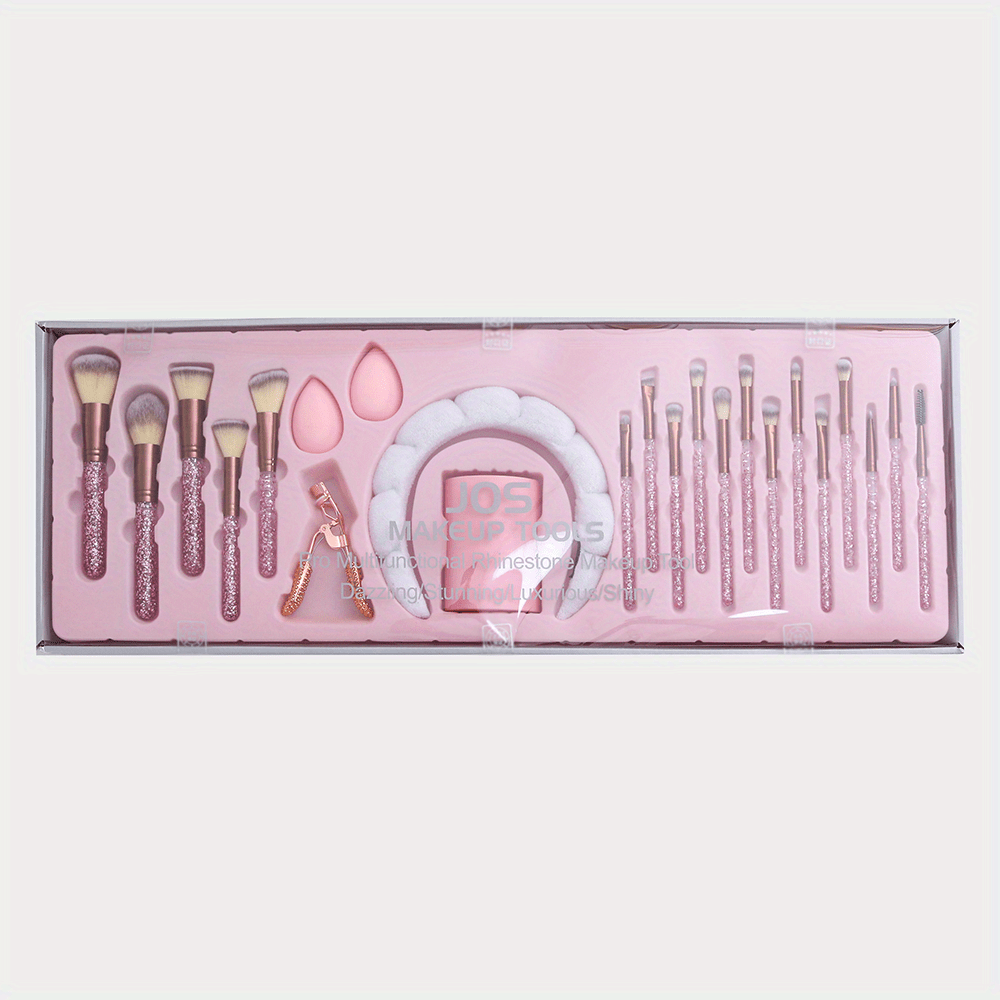 Glam-ready brush set designed for flawless application. This 23-piece makeup brush kit features sparkling rhinestone-accented handles, heavy-duty nylon bristles and versatile oval/elliptical heads for professional-looking face and eye makeup.