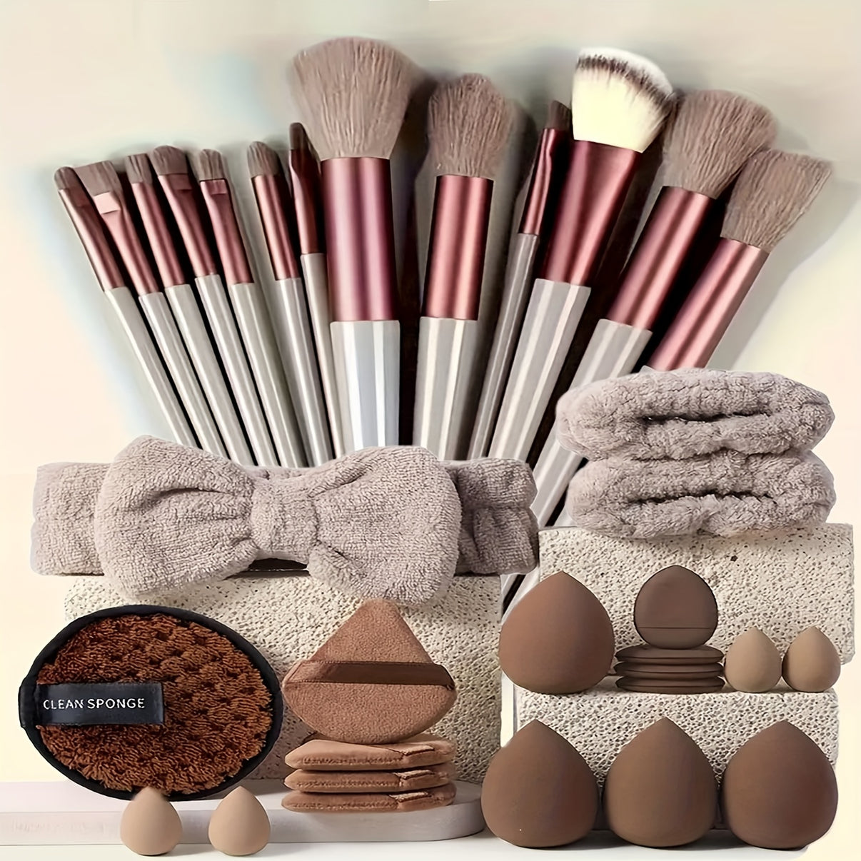 Glow into every day with this complete 33-piece makeup and skincare travel kit. The portable light beige set features nylon-bristle facial massager brushes and essential skincare tools designed for all skin types, perfect for travel, daily routines, and gifting.