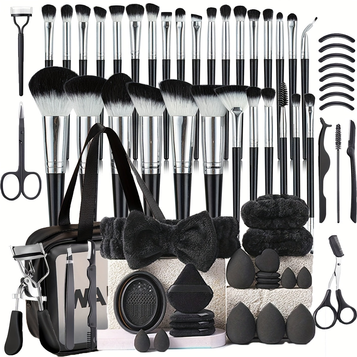 Set Contents: 68 pieces total including 30 black makeup brushes, 20 beauty sponges (puffs), 17 multi-functional eyelash tools, washing bowl set, and a travel makeup bag