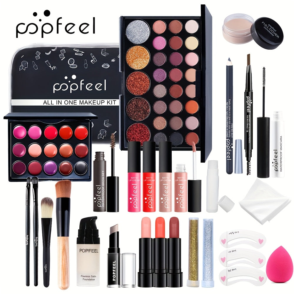 All-in-One Makeup Kit — Eyeshadow, Blush, Foundation, Concealer, Powder & Lipstick with Brush | Beginner Cosmetic Set