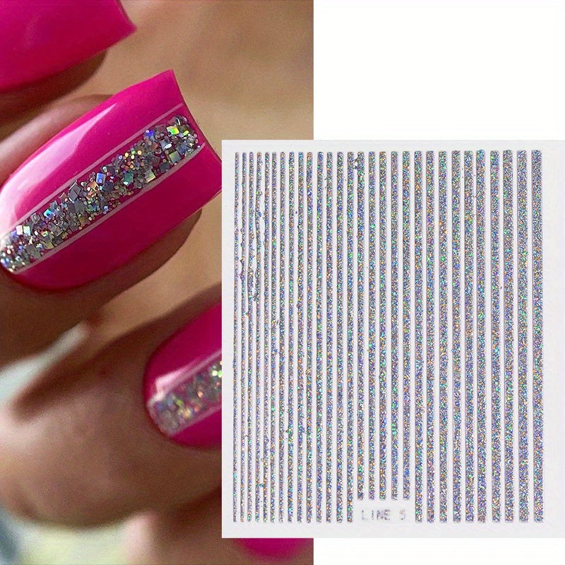 Glisten: Elevate your manicure with 3D holographic nail stickers featuring metallic silver, rose gold and gold stripes plus letter decals for instant salon-quality nail art. Self-adhesive and easy to apply, these shimmery nail sliders add dimension and shimmer to gel or regular manicures.