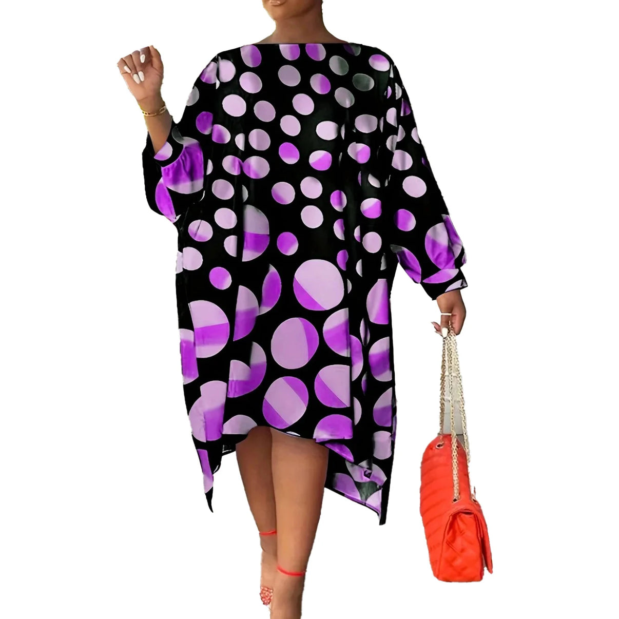 Hashtags: #PlusSizeDress #HighLowDress #PolkaDotStyle
