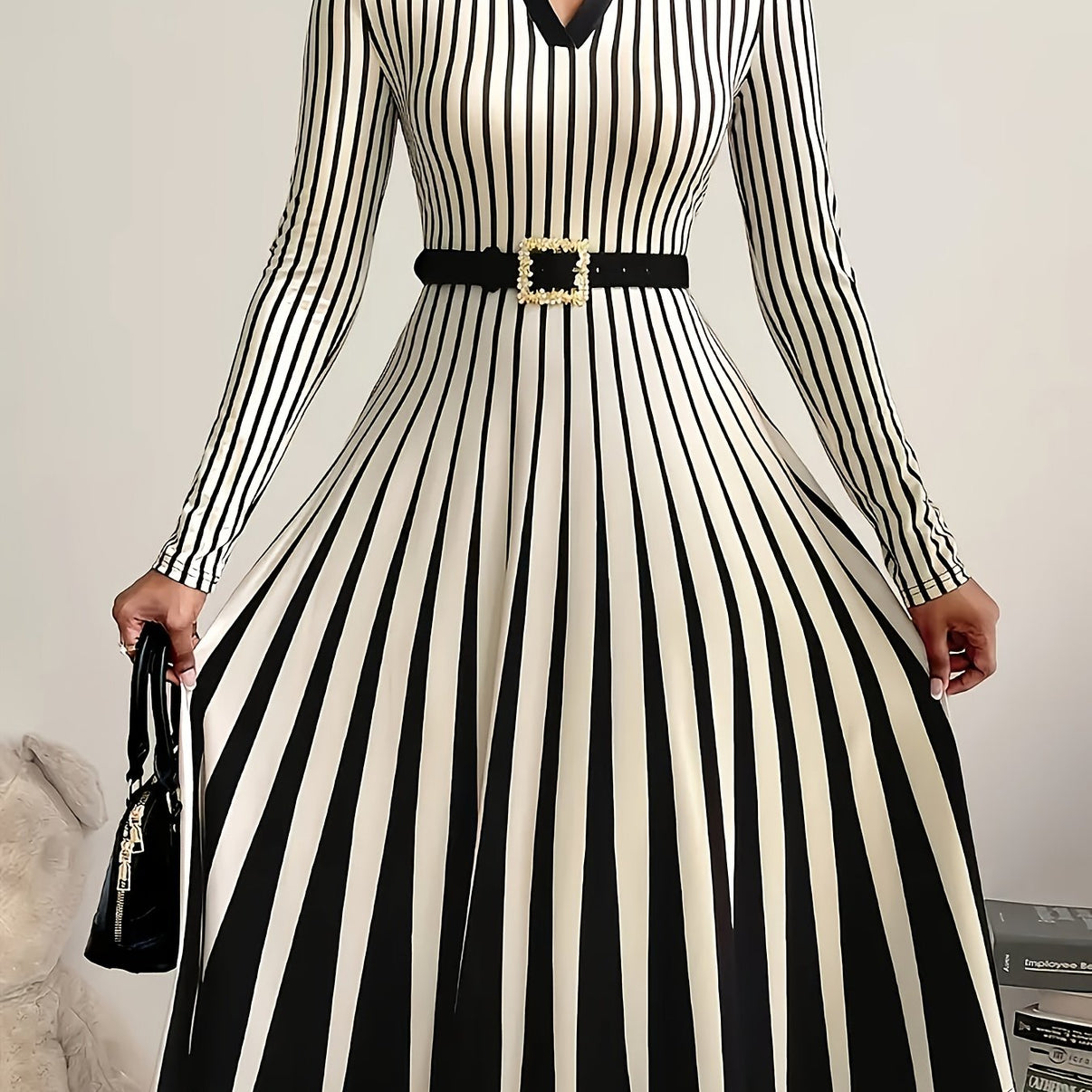 Timeless elegance meets everyday comfort. This black and white striped A-line midi dress features a flattering V-neck, long sleeves and an adjustable waist belt for a polished silhouette that transitions effortlessly from office to weekend events.