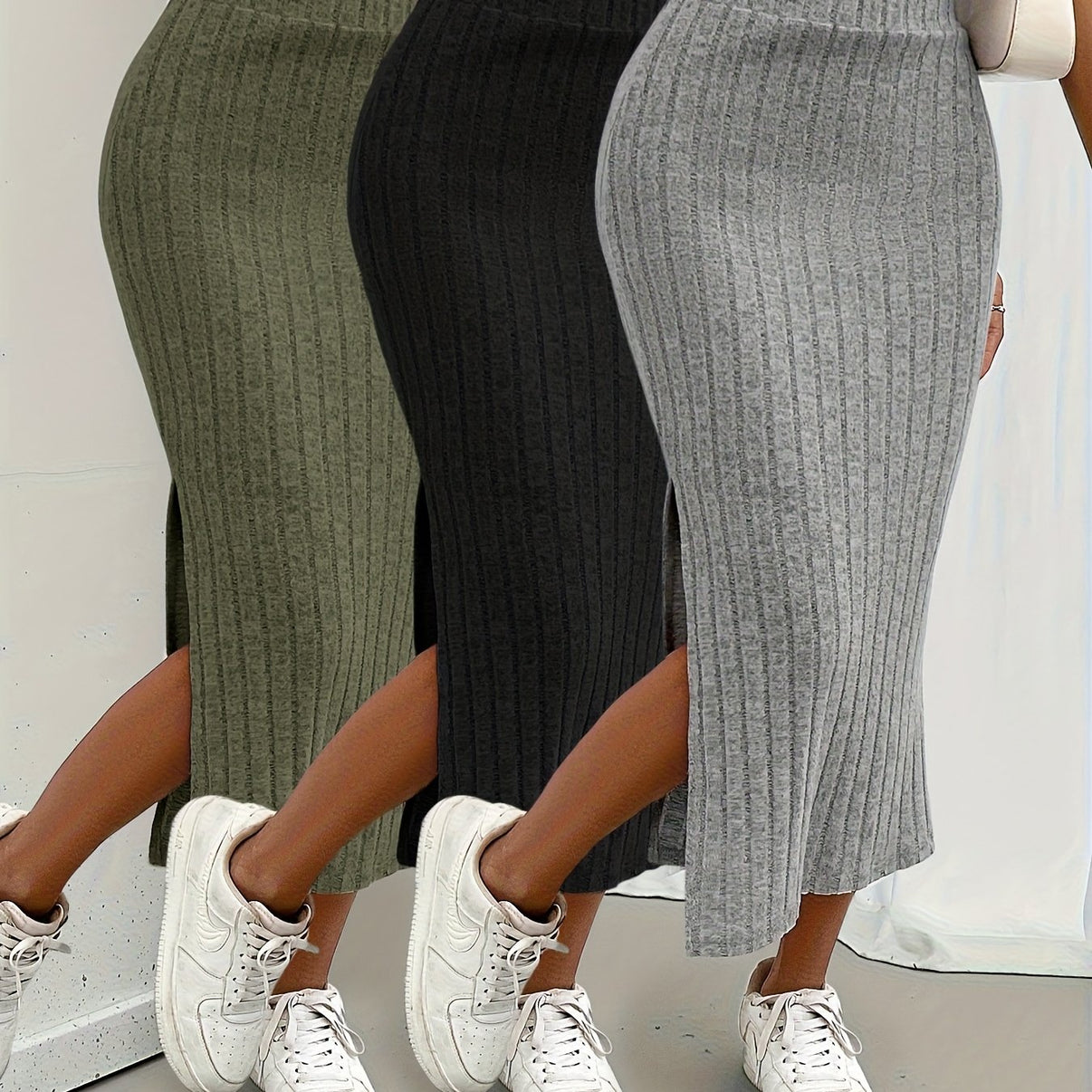 Effortless elegance meets everyday comfort in this 3-pack of high-waist ribbed midi skirts. Featuring a flattering high rise, side slit and mid-elastic knit, these solid-color skirts transition seamlessly from casual daytime looks to polished evening outfits.