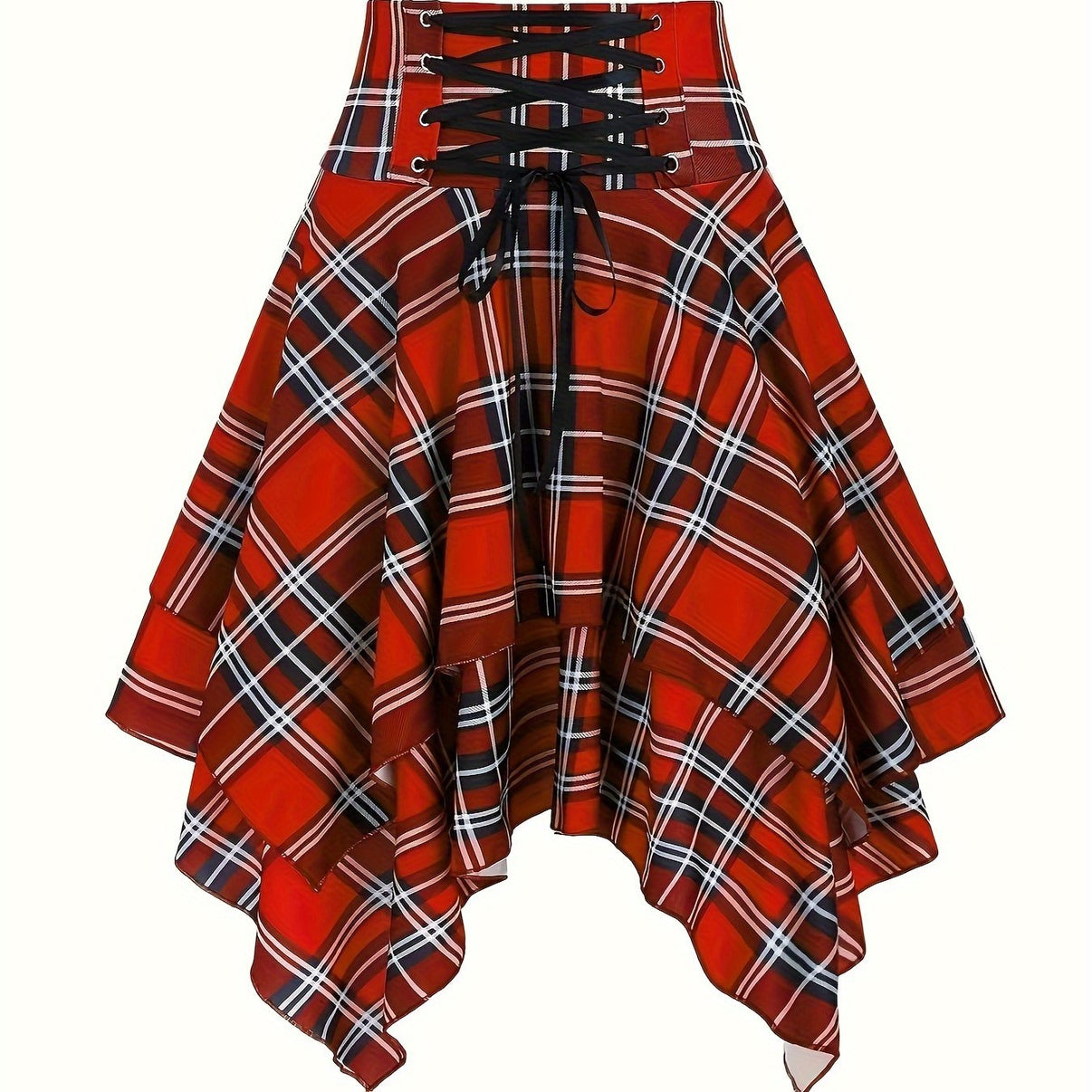 • Design: Plaid pattern, irregular (asymmetric) hem, lace-up tie front, high waist