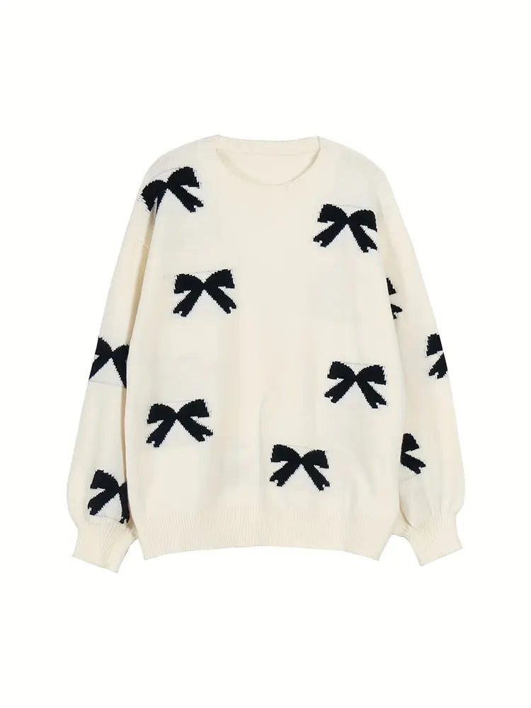 Cozy, thick knit pullover with a feminine bow accent and round neckline — a warm, plus-size essential for autumn and winter casual and Korean-style wardrobes.