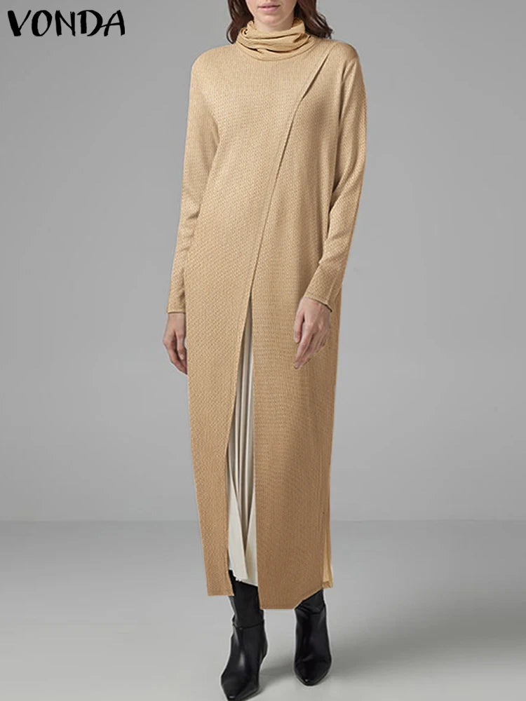 Cozy and flattering, this plus-size turtleneck pullover combines a calf-length silhouette with a split hem patchwork detail for effortless casual elegance. Made from a soft polyester-spandex knit, it offers a loose, comfortable fit ideal for layering in spring, autumn, or cooler summer evenings.