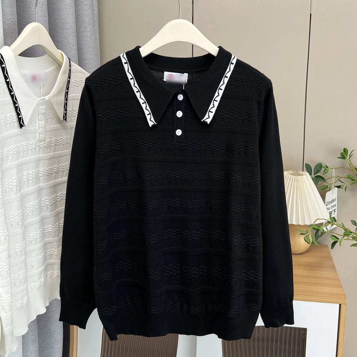 Plus Size Women's Polo Collar Knit Sweater with Hollow-Out Patchwork - Casual Pullover for Spring/Autumn