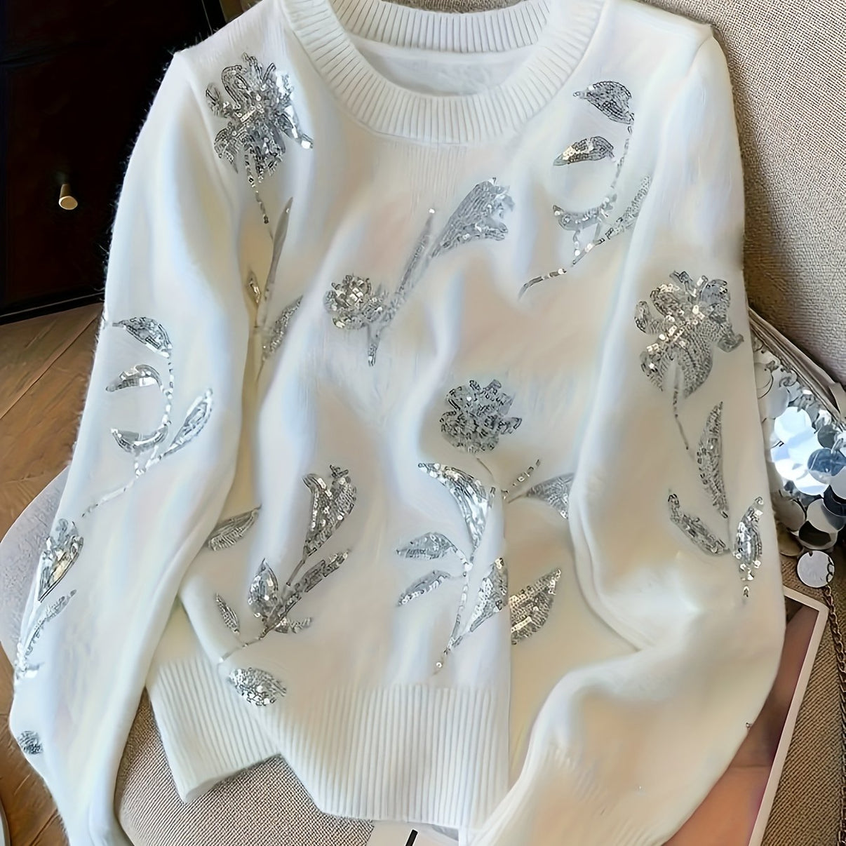 Glamorously elevate your cold-weather wardrobe with this plus size white sequin floral longline sweater. Soft knit fabric with slight stretch provides comfortable warmth while shimmering sequins and a crew neck create an elegant, party-ready look for holiday gatherings, evening events, and formal occasions.