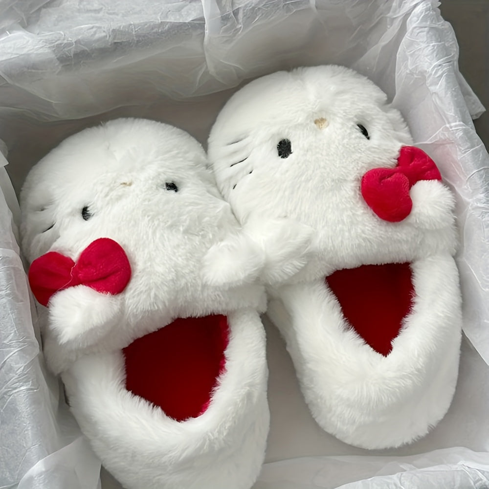 Cozy-ready plush slippers with an adorable bow detail — ultra-soft fabric upper and cushioned EVA insole deliver cloud-like comfort for indoor wear. Fluffy slip-on design and non-slip EVA sole provide warmth, grip, and easy on-and-off convenience; ideal as a gift for holidays, parties, graduations, or everyday home lounging.