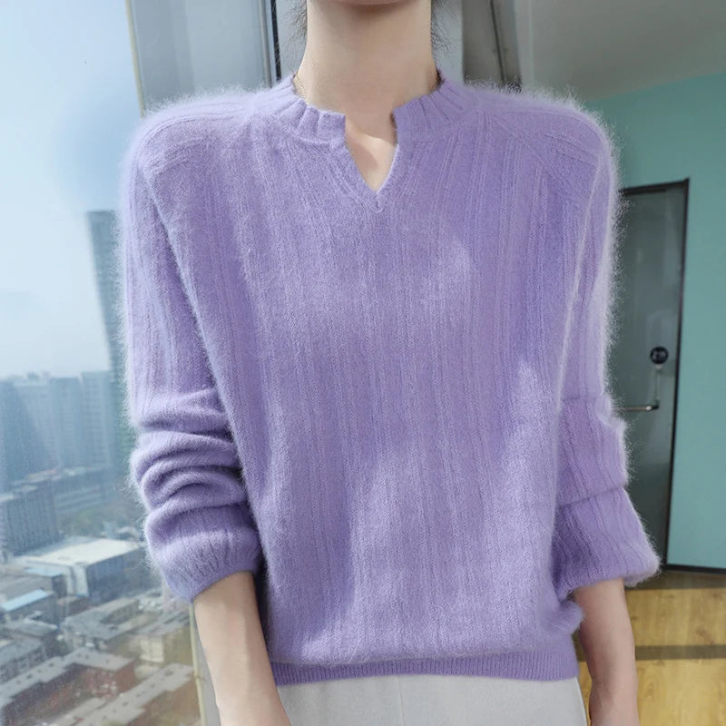 Cozy elegance: a luxurious mink cashmere pullover that combines soft warmth with a refined V-neck and statement lantern sleeves — perfect for office-to-weekend wear throughout autumn and winter.