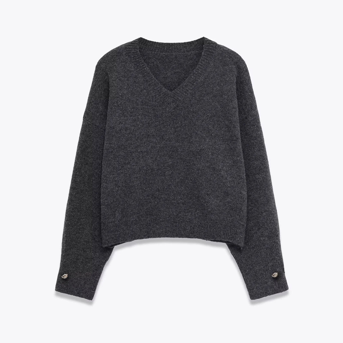 Cozy meets chic. This women's soft V-neck pullover knit sweater features a single-breasted button detail and a relaxed loose fit — ideal for layering through autumn. Medium-weight polyester knit with slight stretch offers comfortable drape, easy care, and everyday casual style.