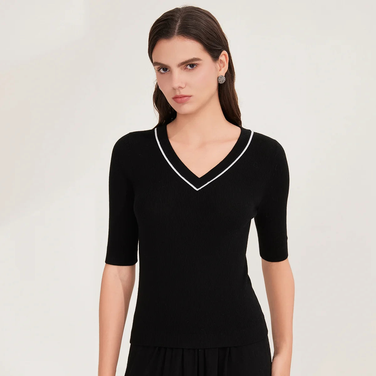 Women's V-Neck Wool Ribbed Pullover Sweater - Lightweight Mid Sleeve, Regular Fit Casual Knit