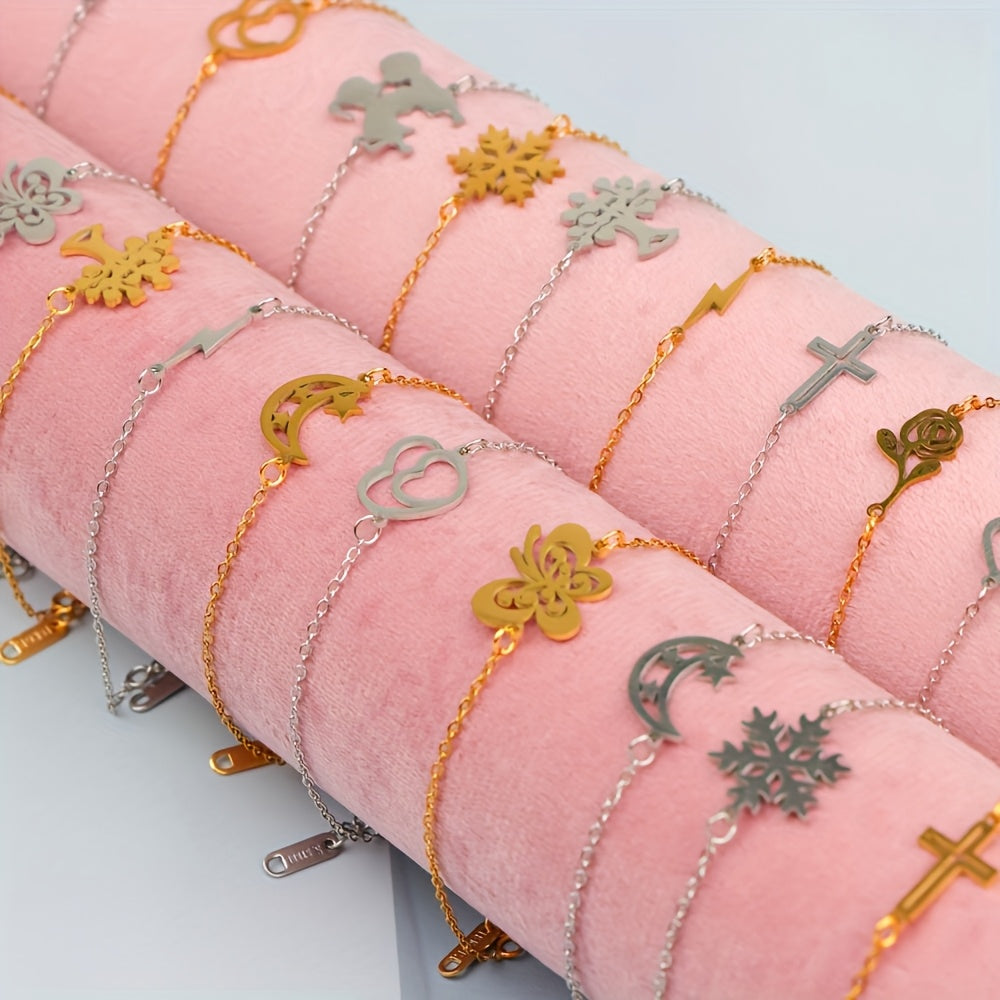 Enchanting and versatile, this 10-piece set of stainless steel moon and snowflake adjustable bracelets adds delicate charm to everyday outfits and party ensembles. Soft pink accents with gold-tone charms create a feminine, layered look—perfect for gifting, bridesmaids, party favors, or personal wear.
