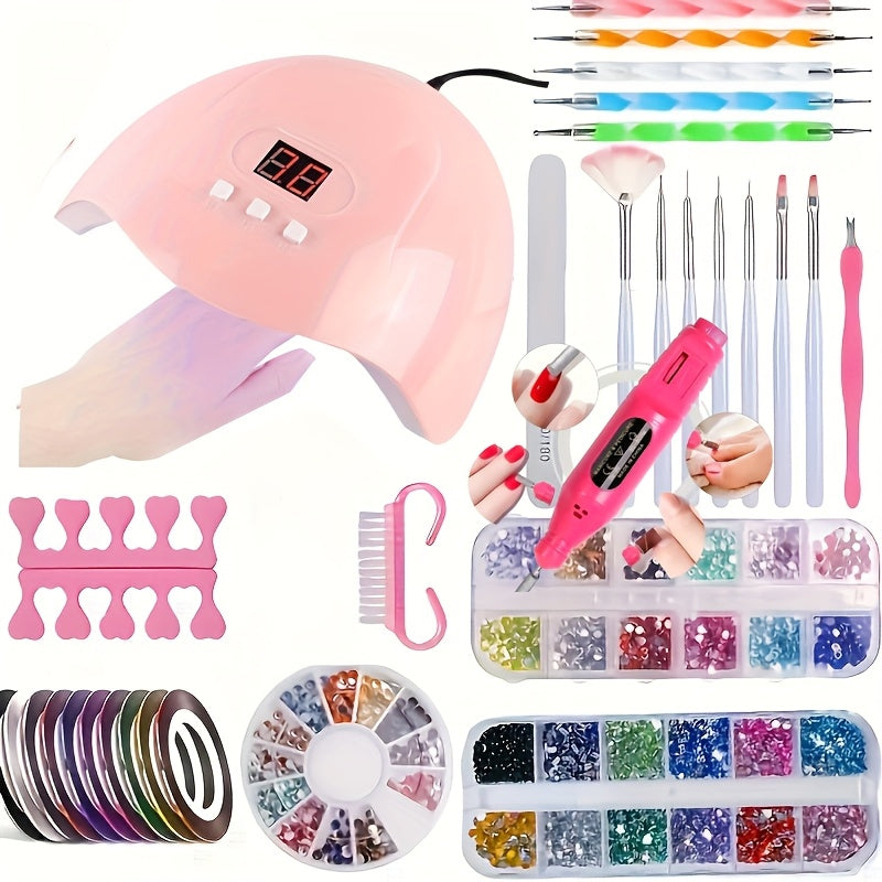 Refresh your at-home nail routine with this 12-in-1 nail art tool set featuring a pink USB-powered LED lamp and precision stainless steel tools for salon-quality manicures and easy nail polish...