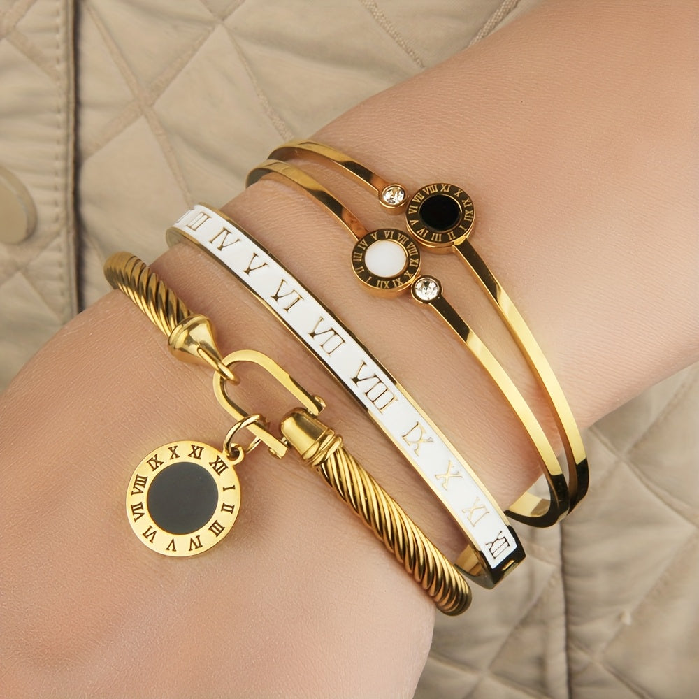 Timeless elegance meets playful color in this 3-piece bracelet set featuring 304 stainless steel, 18K gold plating, and sparkling synthetic cubic zirconia. The simple Roman numeral motif and adjustable design make it ideal for gifts, parties, or everyday wear.