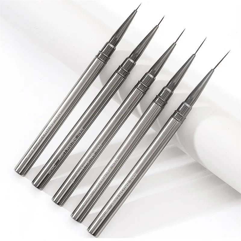 Precision-packed nail art liner set for fine striping, floral details and French tips. Lightweight metal handles and nylon bristles deliver consistent strokes for natural and false nails — ideal for manicures, 3D designs, and professional detailing.