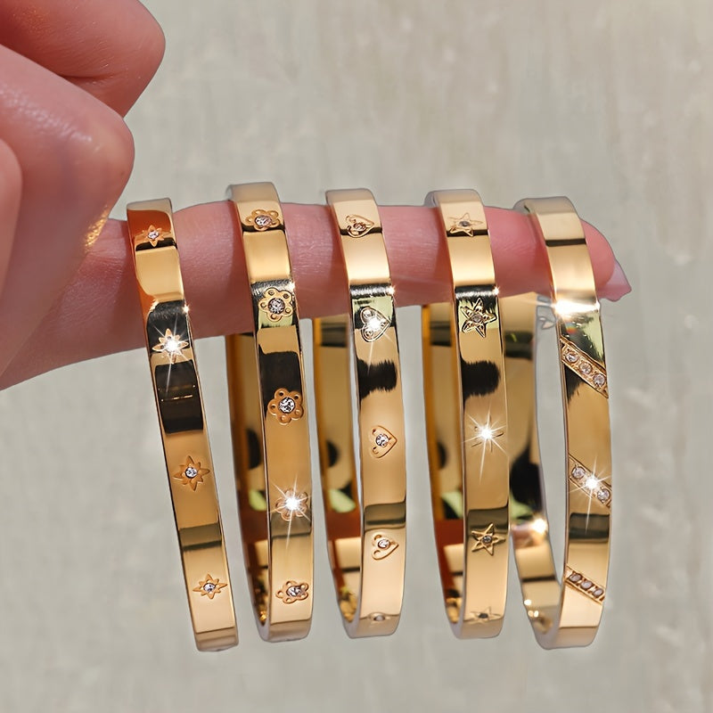 Radiant and versatile, this 5-piece stainless steel bracelet set features star, heart, and flower embossed bangles with rhinestone accents and 18K gold plating. Lightweight yet durable, these shiny bangles add feminine charm to everyday outfits and make a thoughtful gift for her across all seasons.