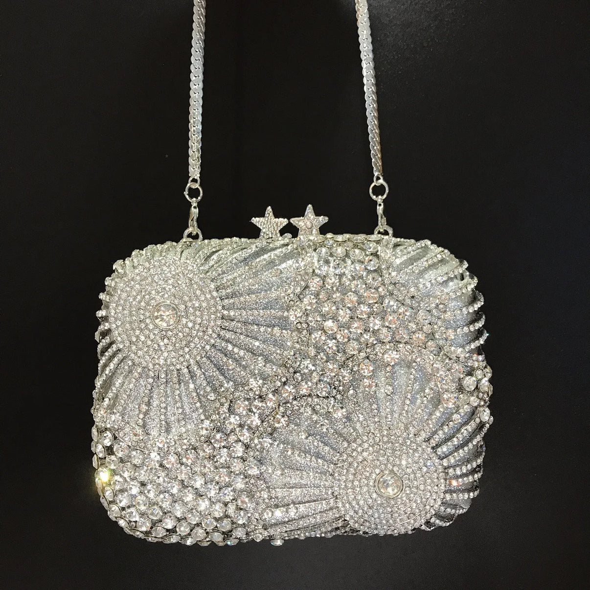 Silver Flower Crystal Bridal Clutch – Rhinestone Minaudiere Evening Bag for Wedding & Party