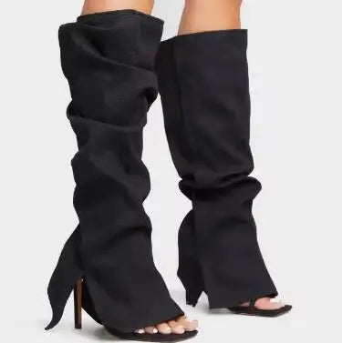 Stride in confidence with these versatile knee-high denim stiletto boots. Featuring a square toe, fold-over strap detail and a slip-on design, these handmade boots deliver bold street-style looks with comfortable PU insole and durable rubber outsole. Ideal for summer nights, casual outfits, or fashion-forward ensembles.